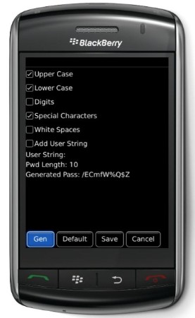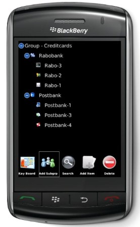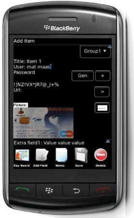 Applicatie gebruikt een sterke encryptie methode die gebruikt maakt van een aantal unieke (pin)codes van de Blackberry Storm zelf (dus uniek voor elk device);